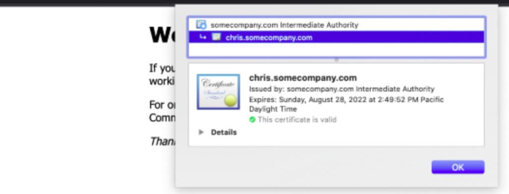 从上面的输出可以看出,证书有效期为 24 小时,对 chris.somecompany.com 有效,包含我们要求的所有内容!