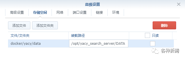 docker/yacy/data | /opt/yacy_search_server/DATA | 存放设置 |