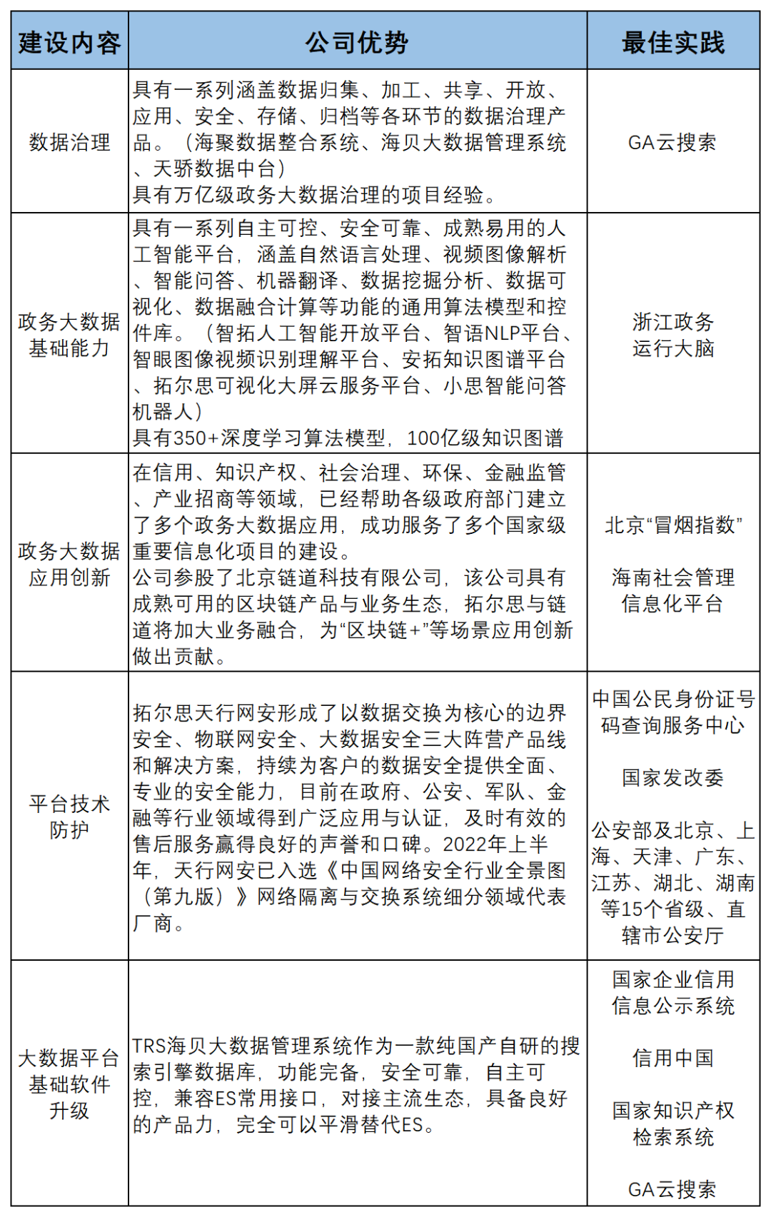 多年来,拓尔思在信用、知识产权、社会治理、环保、金融监管、产业招商等领域,已经帮助各级政府部门建立了多个政务大数据应用,成功服务了多个国家级重要信息化项目的建设,如为国家企业信用信息公示系统、信用中国、国家知识产权检索系统。同时公司也在积极探索政务大数据与互联网开源数据、多模态数据的融合应用创新。公司今年推出的政策大脑、产业大脑等产品,也将帮助各级政府部门在科学制定政策、科学监测区域产业发展和社会发展态势感知等政务大数据应用领域进行不断创新。拓尔思丰富的政务大数据应用创新成果和经验,能够较好地为多行业和多跨场景应用提供多样化服务支撑。