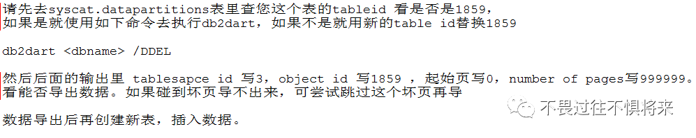 如果无法从备份恢复,那么在数据库可以连接的情况下,可以采用db2look导出表结构和export导出数据的方法来重建数据库。当然对于损坏的表,只能使用db2dart工具离线导出这些表的数据,处于坏页上的数据库极有可能丢失了。