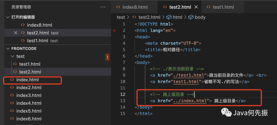 ../ 表示当前文件所在目录的上一级目录,例如:test2页面跳index页面,test2页面跟index页面不是同级目录,index是上一级目录的文件,就使用 ../ 。