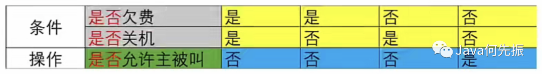 条件桩:从例子中看出有两个条件,一个是是否欠费,一个是是否关机。