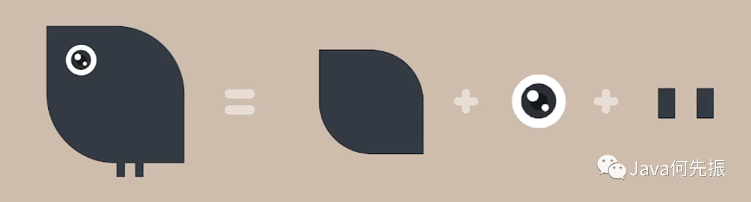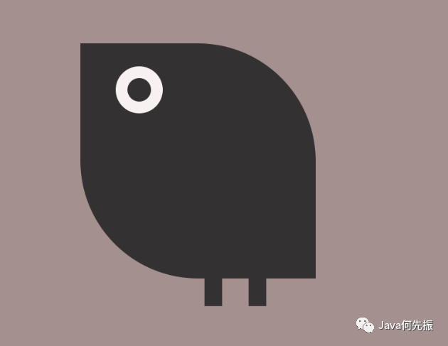 小黑鸟眼睛由圆形组成、腿由长方形组成,身体由两个一个圆,两个正方形组成。