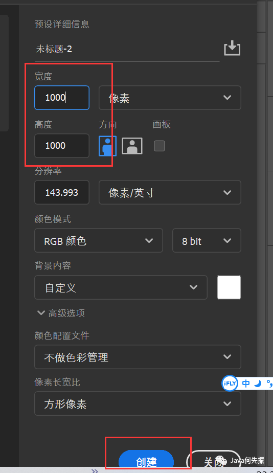 设置纸的大小,定1000*1000的像素,点击创建。