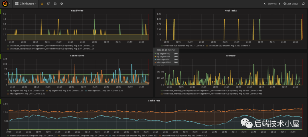 关于ClickHouse的dashboard模板已经有很多,在这里推荐:https://grafana.com/grafana/dashboards/882 将它导入到新建的Grafana dashboard之后,即可得到漂亮的ClickHouse集群看板(可能需要微调)。