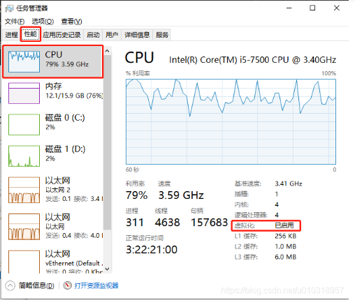 打开任务管理器(CTRL+ALT+DELETE)-> 选择性能 -> CPU ->虚拟化,确认是否已启用。