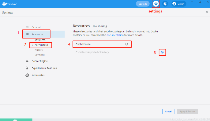 配置Dcoker文件挂载目录权限:左侧菜单 Resources -> FILE SHARING -> 加号 -> D:\clickhouse -> 选择文件夹