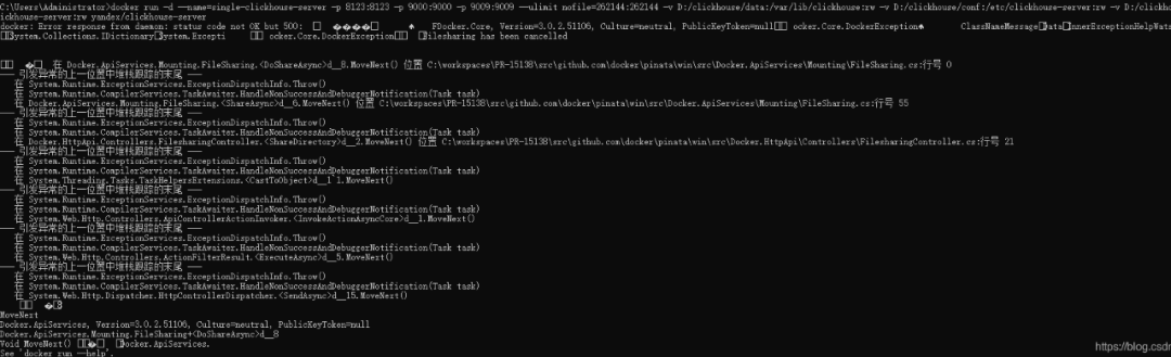 (2) Windows控制台执行命令,映射端口 8123、9000、9009,数据、配置、日志映射到Windows硬盘