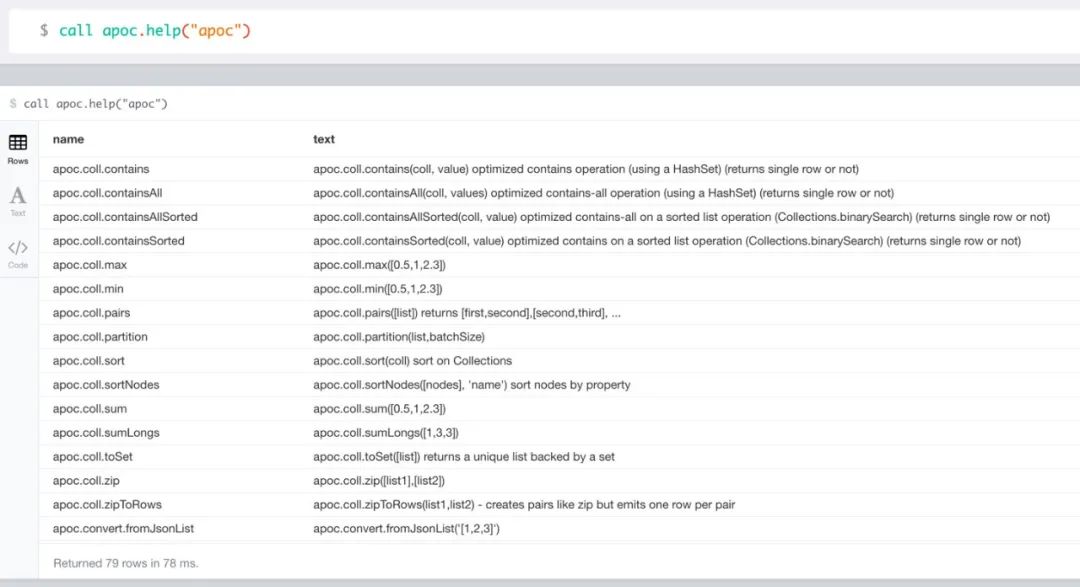 在浏览器界面输入CALL apoc.help('text'),如果成功返回结果。则表示安装成功了。