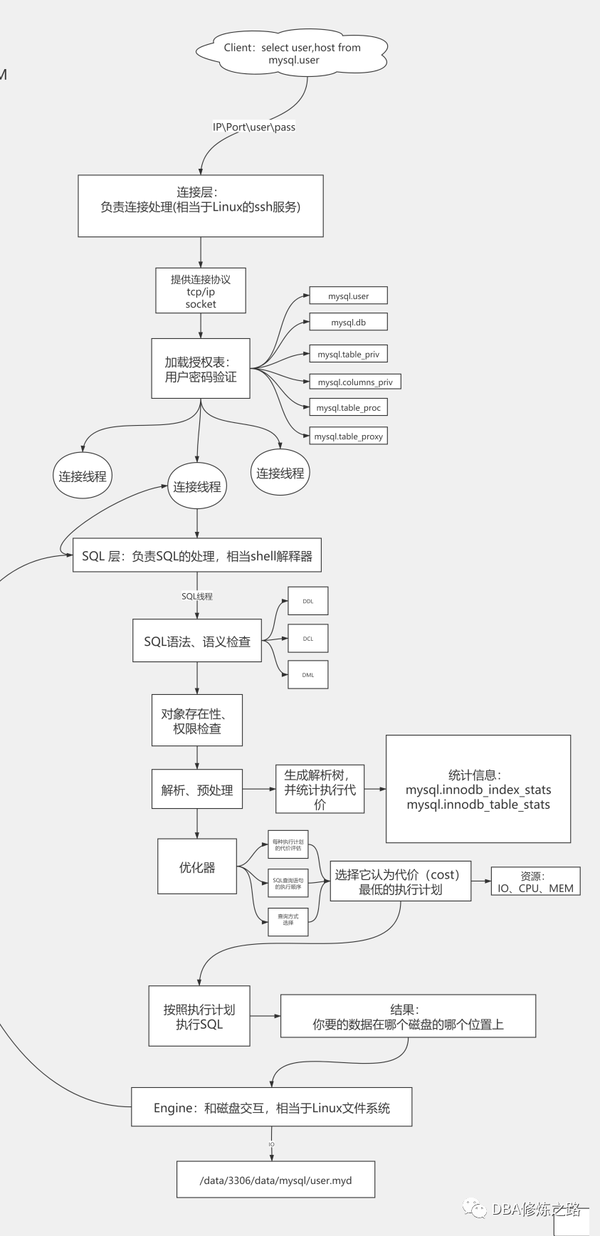 连接协议:tcp/ip 和unix套接字socket 加载授权表:用户密码验证 通过密码验证生成连接线程
