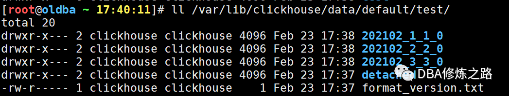 CREATE TABLE test( id UInt8, name String, age UInt8, shijian Date)ENGINE = MergeTree()PARTITION BY toYYYYMM(shijian)ORDER BY id;insert into test values(1001,'张三','18',now());insert into test values(1002,'李四','28',now());insert into test values(1003,'王五','38',now());