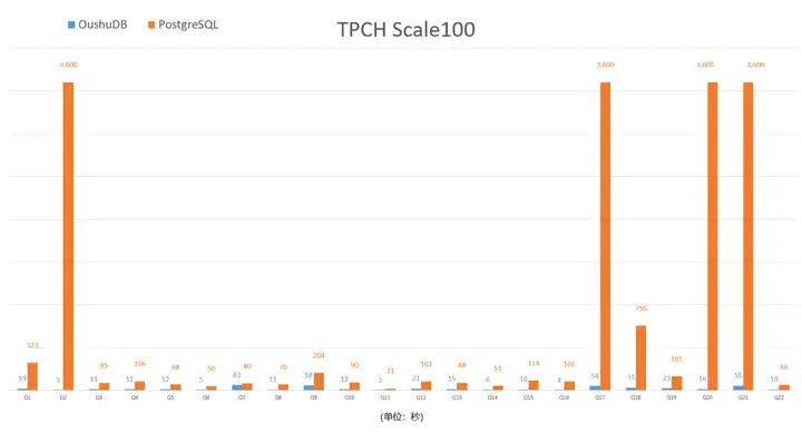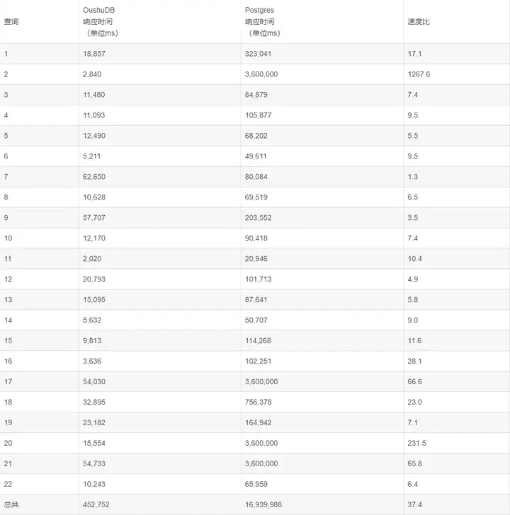 根据TPC-H的测试结果来看,OushuDB综合性能比Postgres快了30倍以上。虽然Postgres是一款很多企业都在使用的十分优秀的数据库,但是在面对海量数据的查询这样的需求时,比OushuDB差的挺远的。