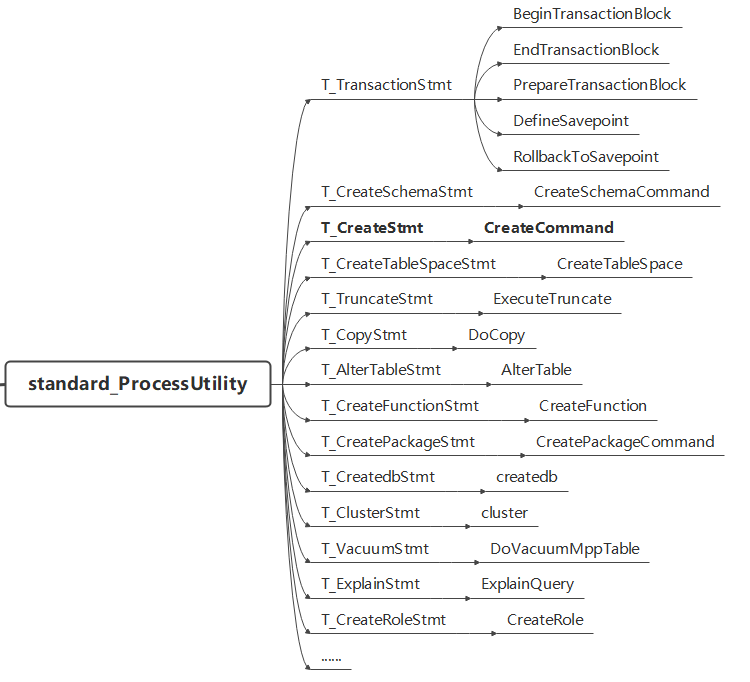 standard_ProcessUtility函数会根据nodeTag(parsetree)的值来确定sql的操作类型,create table一般都是进入T_CreateStmt分支,调用CreateCommand函数。