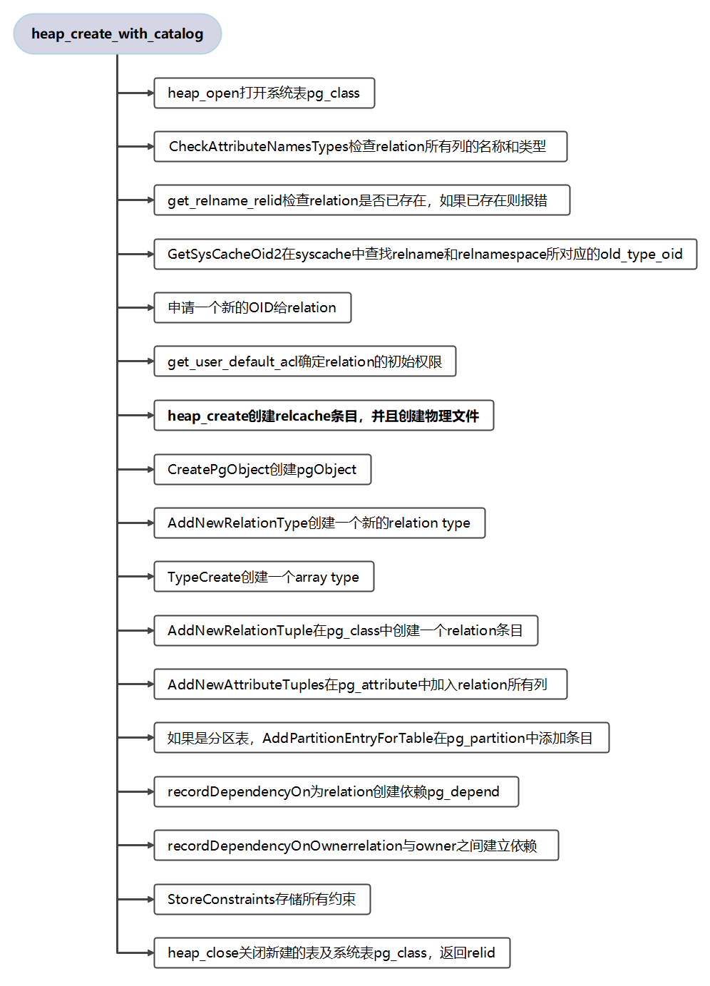 其中heap_create内部首先调用了RelationBuildLocalRelation创建RelationData,并加入到relCache,RelationData表示一个表的元信息,这些信息都可以由系统表元组中的信息构造得到。然后根据这些信息通过调用RelalionCreateStorage函数创建物理文件。heap_create_with_catalog主要完成表物理文件的创建和表元信息注册到系统表中,涉及系统包包括pg_class,pg_attribute,pg_depend,pg_object,pg_type,pg_index和pg_partition。