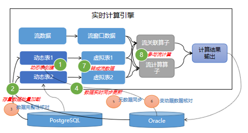 步骤2:同样利用flink的现有能力,对动态表(virtual table)的数据(virtual data)与流表(flow table)的数(flow data)据进行各种类型的计算,如关联(join)、聚合(Aggregate)、取值(GetOneRecord)等计算;