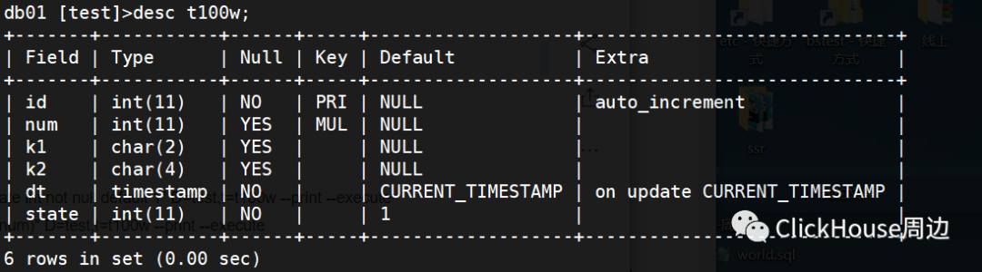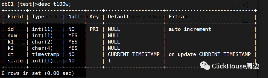 利用MySQL官方提供的t100w的表为基表mysql> source root/t100w.sql;为做归档表中创建索引:mysql> alter table t100w modify id int not null primary key auto_increment;Query OK, 1000000 rows affected (4.88 sec)Records: 1000000 Duplicates: 0 Warnings: 0mysql> desc t100w;+-------+-----------+------+-----+-------------------+-----------------------------+| Field | Type | Null | Key | Default | Extra |+-------+-----------+------+-----+-------------------+-----------------------------+| id | int(11) | NO | PRI | NULL | auto_increment || num | int(11) | YES | | NULL | || k1 | char(2) | YES | | NULL | || k2 | char(4) | YES | | NULL | || dt | timestamp | NO | | CURRENT_TIMESTAMP | on update CURRENT_TIMESTAMP |+-------+-----------+------+-----+-------------------+-----------------------------+5 rows in set (0.00 sec)复制张test1表mysql> create table test1 like t100w;mysql> desc test1;+-------+-----------+------+-----+-------------------+-----------------------------+| Field | Type | Null | Key | Default | Extra |+-------+-----------+------+-----+-------------------+-----------------------------+| id | int(11) | YES | | NULL | || num | int(11) | YES | | NULL | || k1 | char(2) | YES | | NULL | || k2 | char(4) | YES | | NULL | || dt | timestamp | NO | | CURRENT_TIMESTAMP | on update CURRENT_TIMESTAMP |+-------+-----------+------+-----+-------------------+-----------------------------+5 rows in set (0.00 sec)