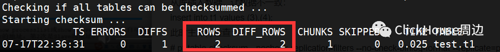 TS ERRORS DIFFS ROWS DIDD_ROWS CHUNKS SKIPPED TIME TABLE07-17T22:36:31 0 1 2 2 1 0 0.025 test.t1TS :完成检查的时间。ERRORS :检查时候发生错误和警告的数量。DIFFS :0表示一致,1表示不一致。当指定--no-replicate-check时,会一直为0,当指定--replicate-check-only会显示不同的信息。ROWS :表的行数。CHUNKS :被划分到表中的块的数目。SKIPPED :由于错误或警告或过大,则跳过块的数目。TIME :执行的时间。TABLE :被检查的表名。