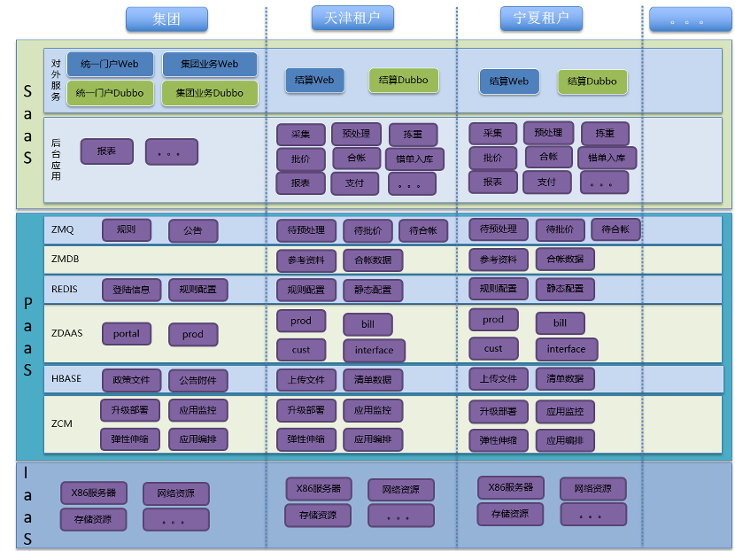随着互联网业务快速发展及终端客户数量不断增长,新的结算需求层出不穷,硬件成本压力越来越大。SaaS层对外服务通过统一门户,根据用户归属租户不同调用不同租户的web服务。SaaS层后台应用通过ZCM的租户管理及容器化,实现各租户应用的独立升级部署、应用编排、弹性伸缩、应用监控等。PaaS层应用均为分布式部署,各租户根据业务量可以申请各应用节点数。IaaS层应用以资源池的方式分配给各个应用,一台主机可以运行多个应用节点,多个租户可以共享一台主机,一台主机服务多个租户。
