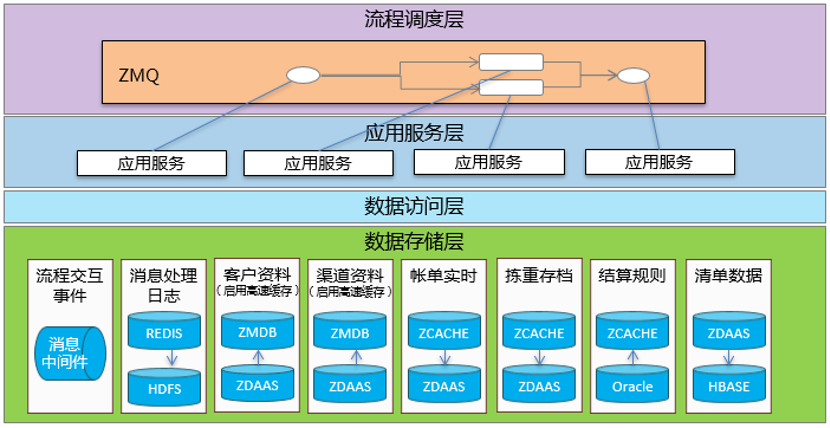 引入ZMDB、消息中间件(ZMQ),NoSql数据库(HBASE)实现数据存储平台化和数据分布式部署,同时对于ZDAAS中的拣重存档、清单、欠费需要实现分库,第一个把我司自研zdaas应用到千亿级数据。采用多租户模式的实现方式省份结算业务的接入。接入省份(宿主运营商)以省份ID为参数登录结算应用平台,平台通过共享集群,控制分配可用的结算应用与服务,省份基于分配的应用能力进行规则配置或者相关结算数据查询,应用通过省份ID获取对应的数据库,保证省份只能看到自己和共享的规则资料并生成省份对应的操作界面,实现能力复用、数据分离。>应用框架部分