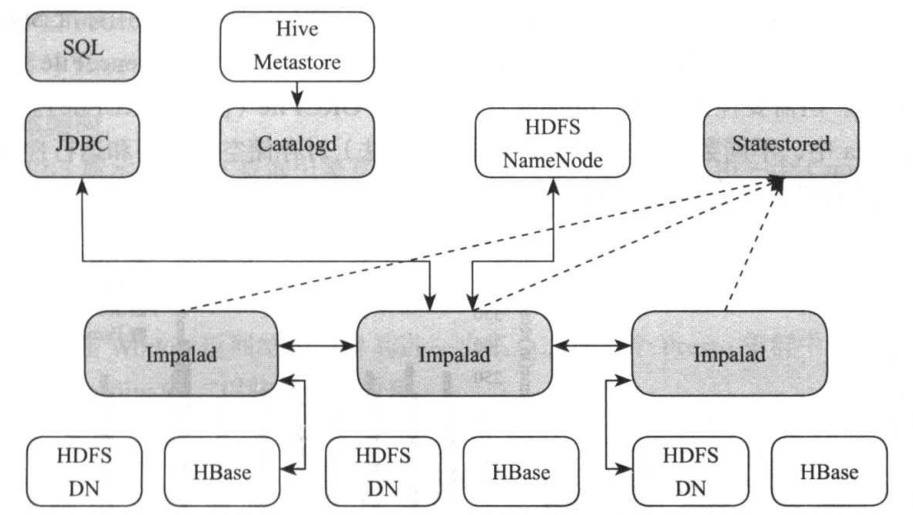 Impala采用对等式架构,所有角色之间是对等的,没有主从之分。Impala主要由三类服务组件构成: