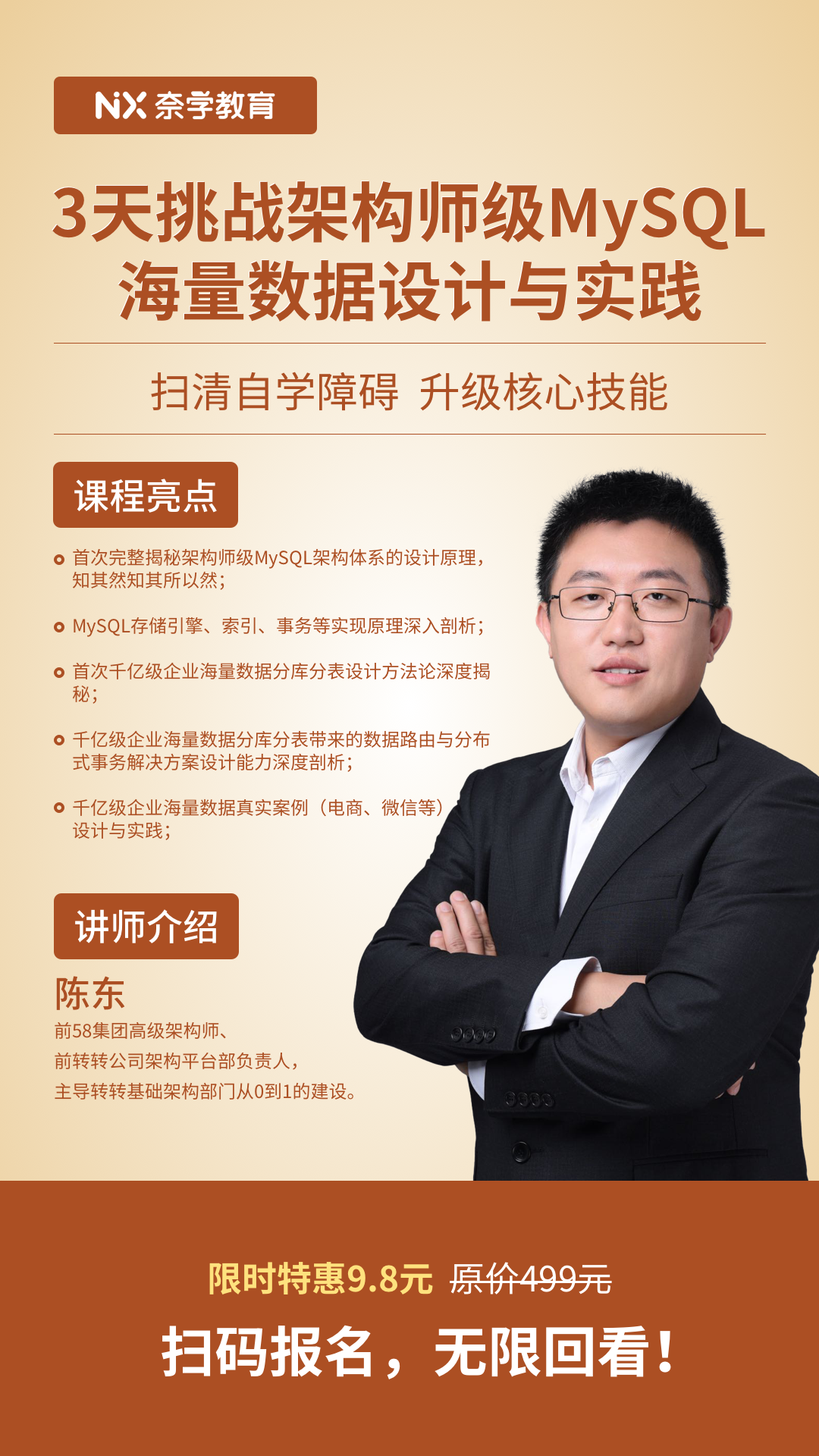 由前58技术委员主席孙玄联手58到家CTO沈剑老师,结合10多年一线大厂实践经验,打造的《3天挑战架构师级MySQL海量数据设计与实践 》精品课带你快速掌握MySQL核心架构技术,如果学完后还不能真正掌握MySQL架构体系,来找我算账就好……