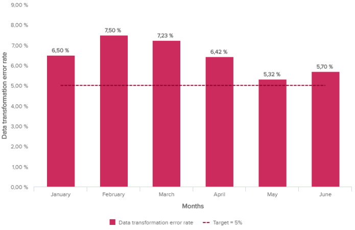严格来说,一致性指定从不同数据集中提取的两个数据值不应相互冲突。然而,一致性并不自动意味着正确性。一致性的一个例子是一个规则,它将验证公司每个部门的员工总数不超过该组织中的员工总数。完整性将表明是否有足够的信息来得出结论。完整性可以通过确定每个数据条目是否是“完整”数据条目来衡量。所有可用的数据输入字段必须完整,并且数据记录集不应缺少任何相关信息。例如,可以使用的一个简单质量指标是数据集中的空值数量:在库存/仓储环境中,这意味着每一行项目都引用一个产品,并且每个项目都必须有一个产品标识符。在填写该产品标识符之前,该行项目无效。然后,应该随着时间的推移监控该指标,以减少它。也称为数据验证,可靠性是指对数据进行结构测试,以确保数据符合程序。这意味着没有意外的数据错误,并且它对应于其适当的名称(例如,日期、月份和年份)。在这里,一切都归结为数据转换错误率。要使用的指标跟踪有多少数据转换操作相对于整体失败或者以一种格式存储的数据并将其转换为另一种格式的过程未成功执行的频率。在下面的示例中,转换错误率随时间变化:
