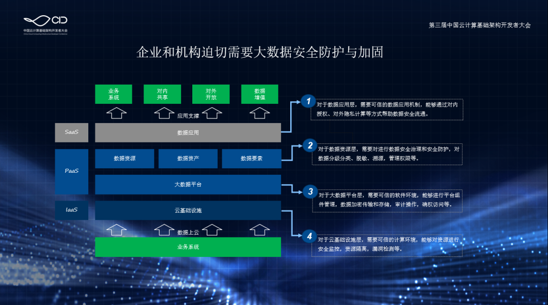 企业和机构迫切需要大数据安全防护与加固,对于数据应用层,需要可信的数据应用机制,能够通过对内授权、对外隐私计算等方式帮助数据安全流通;对于数据资源层,需要对进行数据安全治理和安全防护,对数据分级分类、脱敏、溯源,管理权限等;对于大数据平台层,需要可信的软件环境,能够进行平台组件管理,数据加密传输和存储,审计操作,确权访问等;对于云基础设施层,需要可信的计算环境,能够对资源进行安全监控,资源隔离,漏洞检测等。
