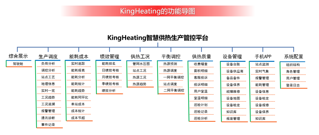 KingHeating是一款针对供热企业的智慧供热生产管控平台,将生产过程数据和业务管理数据有效结合起来,进行一平台建设,一体化管理。该平台涵盖生产调度、能耗成本分析、绩效考核、供热工况、平衡调控、供热质量、设备管理等业务模块,可服务于供热企业监控、集团管理、行业监管等场景,能够帮助企业用户完成供热全闭环管理和数字孪生。产品以价值创造为导向,通过“建一平台,拥多系统”,帮助用户修炼深厚的“供热内功”。