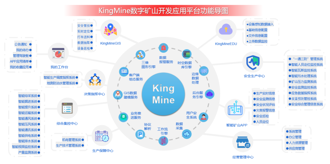 KingMine是一款面向矿山采、洗、炼等行业的数字化系统开发应用平台,能够帮助矿企用户、矿山行业信息化系统实施商、行业相关科研机构等用户,提供一款便捷、易用、安全、高效的覆盖矿山多业务场景的“采、存、算、看”等全业务流的数字化系统开发应用服务平台工具,便捷高效的实现包括综自管控、综合调度、经验决策等涵盖矿山全业务流程数字化的研发与项目落地。KingMine产品依托亚控WellinOS云操作系统研发,可通过亚控独创的“时空数据库”实现矿山全量数据(OT/IT/图像/音视频)的采集、存储、分析、服务,为每条数据赋予时间、空间以及自身特质属性从而统一数据资产。矿山建模全组态、交互界面全组态、数据接入全组态、生产业务全组态的全方位组态式系统搭建提升企业开发效率。其中矿山业务模型结构、生产业务流程自定义、人员排班及岗位职责高度实现配置化,使配置化业务流程赋能数字化自主可控。同时,KingMine产品基于亚控近三十年的矿山行业实践,以及与众多矿山专业领域校企与集成商共同组成了亚控行业生态合作伙伴圈,让企业可实现低代码功能模块移植,不仅只需简单的配置即可完成复用,还可实现单模块的精准升级,无需调整系统,助力更新低成本迭代。为企业提供全组态、全融合、高安全、全拓展、易部署、易维护、全信创、产权化的八大核心商业价值,彻底解决广大用户在建设智慧矿山众多业务系统过程中的工具平台选型的“困扰”。