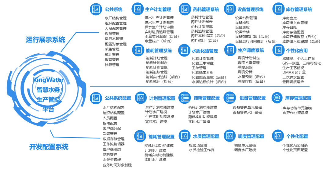 KingWater是一款面向供水、排水、污水等水务行业的智慧水务生产管控系统的应用与开发平台产品,能够帮助水司、水务行业集成商、智慧水务系统实施商等快速构建生产计划、生产调度、水质、能耗、药耗、设备、物资、库存等多个管控系统。KingWater产品依托本次发布的WellinOS云操作系统研发,通过全组态、全配置式帮助客户快速实现智慧水务“百种千条”的软件需求,进而快速构建智慧水务大平台。KingWater产品具备提供场景叠加“自述自化”、流程调整“立等可用”的产品特性,可以综合管控水务过程中的原水、取水、制水、输水、加压送水、用水、排水等环节,实现全流程监管,实现全流程远程监管和智能联动控制,优化生产调度,保障高效供水,促进节能降耗,降低产销差,是水司实现智慧化运营的重要途径。河长制管理、智慧水厂、污水厂一体化等,有效管控水务全过程的实时记录、问题上报、整改提升,使水务各环节实现闭环式管理,帮助企业实现供排水安全、水质达标、节能降耗、提质增效的商业价值。KingWater平台产品具备“一揽子”解决方案能力,可以帮助企业彻底解决在建设智慧水务系统中平台选型的“困扰”。
