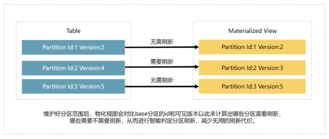 再来看调度框架的核心架构。调度框架包含这几方面的内容,一个是调度器,然后是 Task 和 TaskRun,Pending 队列、Running 队列以及 TaskRun history 集合。以手动刷新任务举例,首先基于 Task 去创建 TaskRun 对象,存放在 Pending 队列中。调度器会取出 Pending 队列中的 TaskRun 做相应的执行,并存放到 Running 队列中,同时会基于 TaskRun 运行的状态,进入到 TaskRun history 集合中。在调度框架中也有一些参数可以配置,比如现在我们队列长度默认是 500,并发数默认是 20,TaskRun 默认是清除是三天以上的历史。有了 Task 框架,我们还需要进行分区的刷新维护。在创建物化视图的时候,实际上我们指定了物化视图跟某一个 Base 表分区的绑定关系,刷新框架会在刷新前增删分区,以保证物化视图的分区大于 Base 表绑定的分区。以图中举例,假设我们有这样一个表,它有三个分区 A、B、C,物化视图也有三个分对应的分区 A、B、C,它们是一一对应关系。除了这么种 1:1 的映射关系,实际上其中还有 1:n、n:1 以及 n:n 的映射关系。有了分区映射关系,就可以基于分区的映射关系去做对应的一些刷新。我们是基于分区的版本去判断哪些分区需要做刷新。以图上举例,假设 Base 表有 1、2、3 三个分区,物化视图也有 1、2、3 三个分区,Base 表分区 1 的版本是 2,物化视图分区 1 的版本也是 2,这个时候我们是不需要去做刷新的。假设 Base 表的分区 2 版本是 4,而物化视图的分区 2 版本是 3,这个时候我们判断需要去做进一步刷新。那么怎么样去做刷新,实际上是依靠于我们底层的 Insert Overwrite 技术。