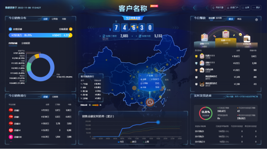 秒级更新的数据大屏可以说是企业经营管理层的驾驶舱,可以直观、全面的了解到每天的销售、发货情况,同时可以更快、更精准地发现问题,防控风险,提高管理的时效性。