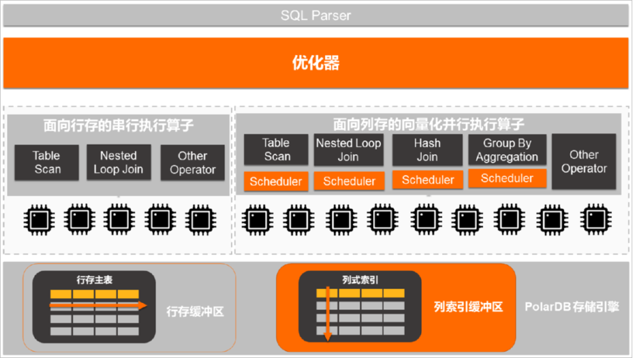 存储引擎:支持实时事务级别一致性的行列混合存储; 执行算子:面向列存的向量化并行执行算子,支持极速的单表和多表查询; SQL Parser/优化器:面向行列混合存储的CBO优化器,可以根据代价自动选择行存或者列存执行查询请求;