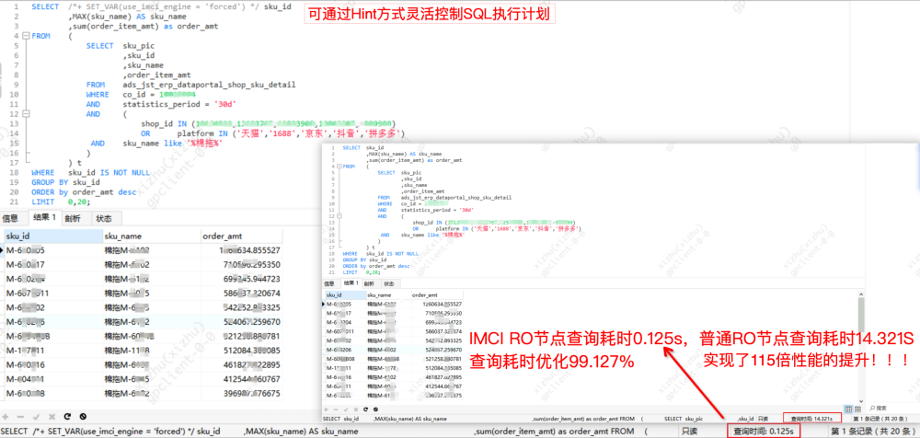 使用列存索引后SQL查询性能提升超过100倍,同时借助PolarDB Proxy节点的智能路由能力,OLAP查询可以自动路由至PolarDB IMCI节点并选择列存索引执行SQL,做到了OLTP和OLAP架构一体化的体验。