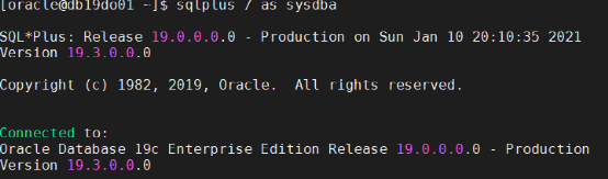 [oracle@db19do01 ~]$ sqlplus as sysdbaSQL*Plus: Release 19.0.0.0.0 - Production on Sun Jan 10 20:10:35 2021Version 19.3.0.0.0Copyright (c) 1982, 2019, Oracle. All rights reserved.Connected to:Oracle Database 19c Enterprise Edition Release 19.0.0.0.0 - ProductionVersion 19.3.0.0.0