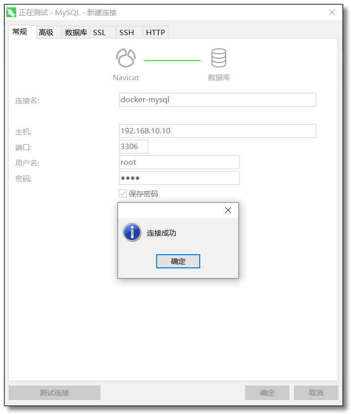 连接容器中的 MySQL 时,只需要连接宿主机的 IP + 指定的映射端口即可。