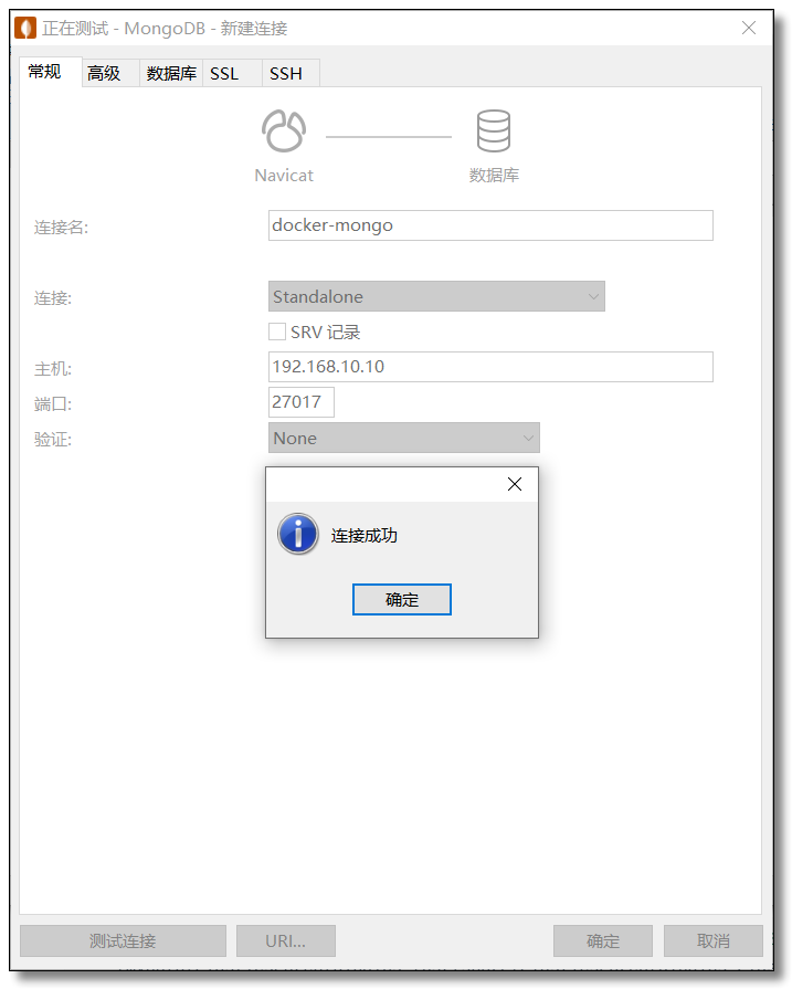 连接容器中的 MongoDB 时,只需要连接宿主机的 IP + 指定的映射端口即可。
