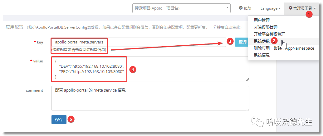 ❝对于 1.6.0 及以上版本,可以通过 ApolloPortalDB.ServerConfig 中的配置项来配置 Meta Service 地址。