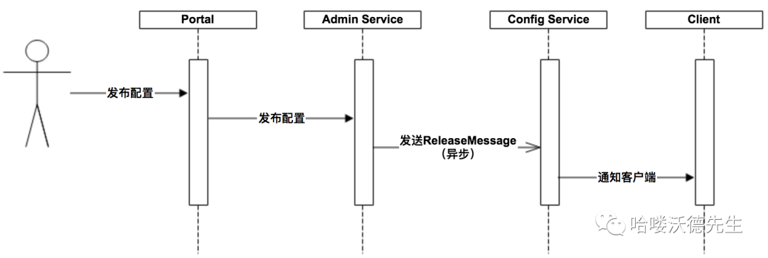 用户在Portal操作配置发布 Portal调用Admin Service的接口操作发布 Admin Service发布配置后,发送ReleaseMessage给各个Config Service Config Service收到ReleaseMessage后,通知对应的客户端