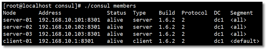 在任意一台服务器中输入以下命令可查看集群中所有节点信息。