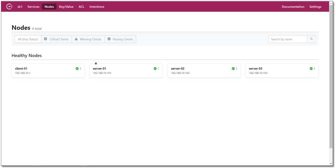 访问:http://192.168.10.101:8500/ 或者 http://192.168.10.102:8500/ 或者 http://192.168.10.103:8500/ 集群任意节点都可看到以下界面说明集群环境搭建成功。