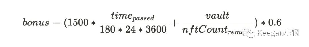 其中,time(passed) 是从游戏开始到 burn 的那一刻之间的时间差,180 * 24 * 3600 则是整个游戏的时间,即 180 天,vault 为奖金池里的当前金额,nftCount(remain) 则是剩余还没有 burn 的 NFT 总量。