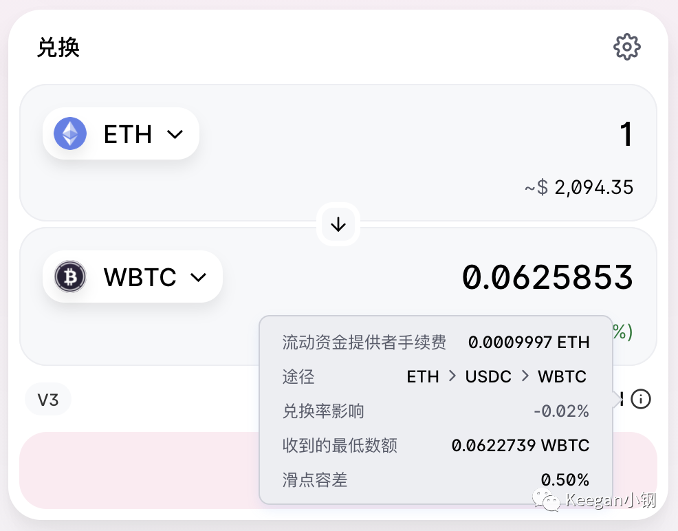 有些人可能会陷入一个误区,觉得最优路径应该是最短路径,而实际上:最短路径不一定是最优路径。比如,ETH-WBTC 其实存在直接配对的流动性池子,所以最短路径就是 ETH > WBTC,但是,在界面查询时看到匹配的最优路径却是 ETH > USDC > WBTC,请看下图: