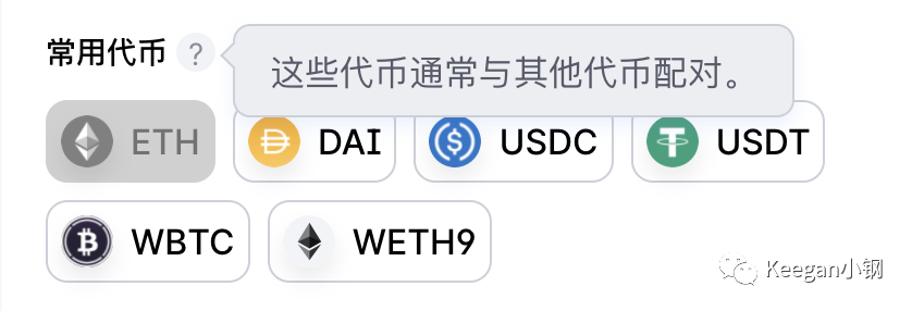 寻找最优路径的第一步,要先找出所有潜在路径。但是,币种那么多,不可能将所有币种都进行路径组合,尤其在合约层面,效率太低了。其实,如果看看 Uniswap 前端页面,选择代币时,可以看到列出了几种常用代币,如下图: