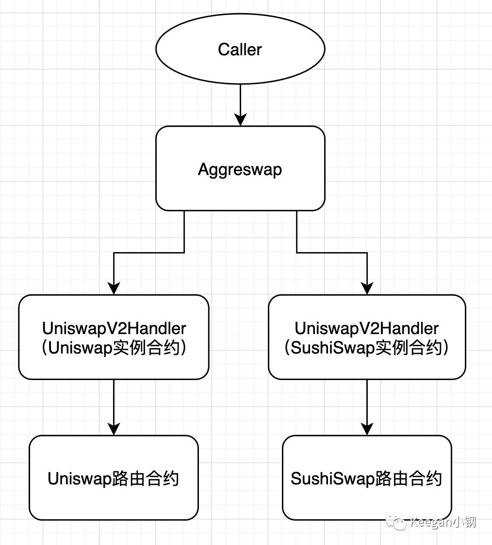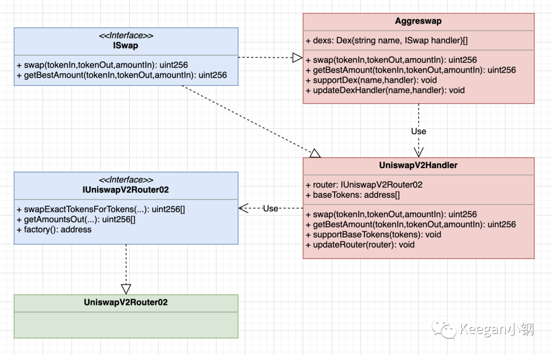 在 Aggreswap 中保存一个 dexs 数组,用来存放所支持的 DEX,当调用 swap() 时,则遍历所有 Dex,查出具有最优价格的 Dex 并转给该 Dex 的 Handler 实例去完成兑换工作。