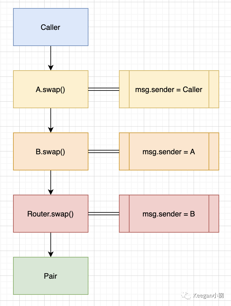 首先,先搞清楚在整个链条中,每一步的 msg.sender 是谁?像这种合约之间的直接调用,msg.sender 都是上一步的调用者,如下图:
