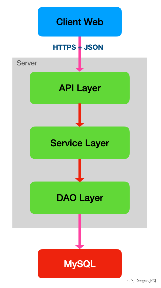 总的来说,MVP 版本整体设计是前后端分离的。API 统一采用 HTTP 通信协议 + JSON 传输协议,并加上 TLS 对传输数据进行加密。用户鉴权采用了 JWT 方案,可实现为无状态化。API 接口总共定义了 19 个,按业务领域划分为了 用户、账户、交易、行情 4 个模块。查询类的读请求统一用 GET 方法,非查询类请求统一用 POST 方法。实现流程上,也没用缓存,没用 MQ 等中间件,数据库只用了 MySQL,交易撮合也采用了实现简单的数据库撮合的方案。接入了两个第三方平台,一个是阿里云邮箱推送平台,用于发送邮件;一个是用于对接以太坊区块链的 infura 平台。数据库设计方面还提了一些设计规范和原则,按照 DDD 的设计思想,最后设计出了 9 张表。服务端是个单体应用,内部采用了简单的三层架构,分为了 API 层、Service 层、DAO 层。