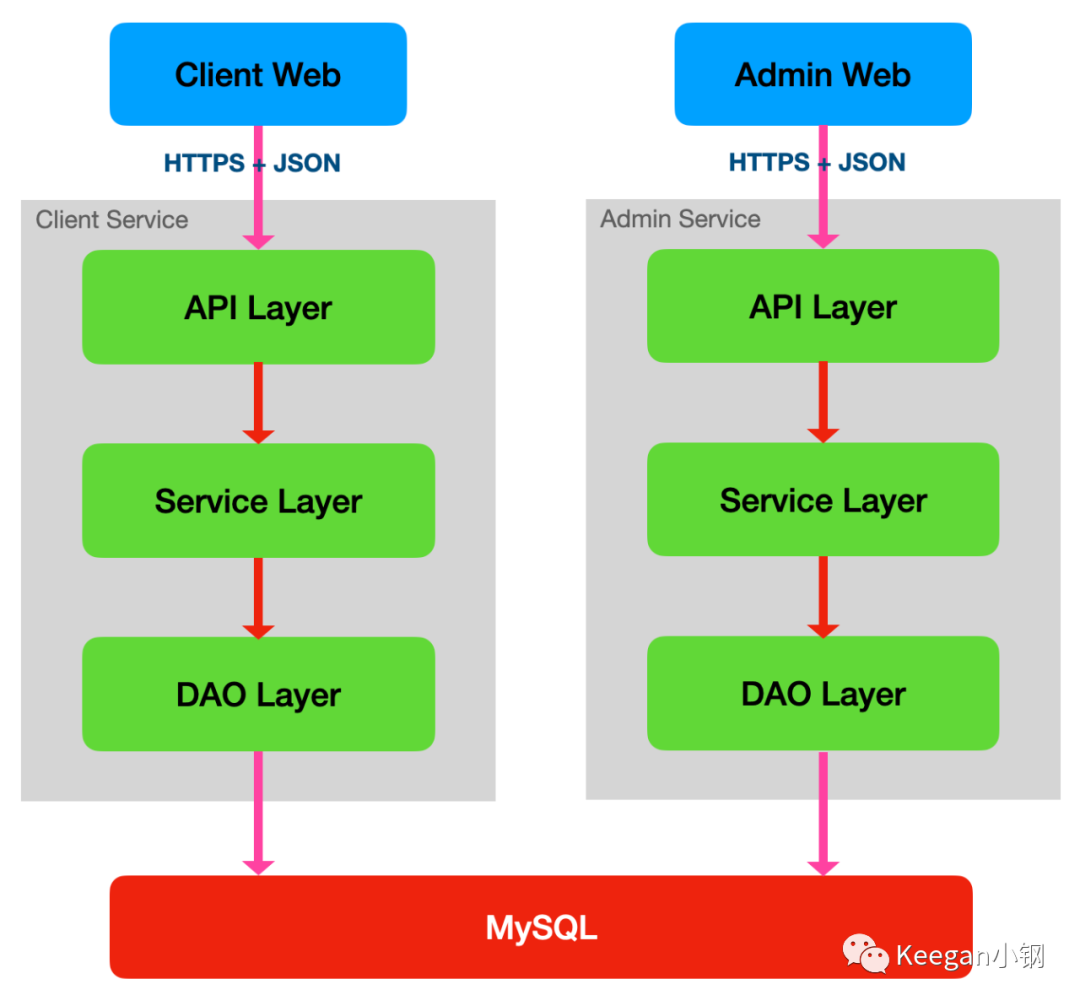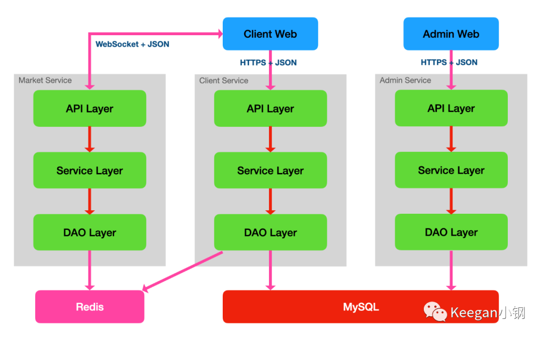 管理端和客户端有着很不一样的功能特性,很多业务逻辑也都不一样,管理端的用户相比客户端用户还有着更多的数据权限,因此,管理端和客户端通常都是分开为不同服务,但底层数据库则是同一套。加上管理后台之后,整个交易系统的整体架构大致如下: