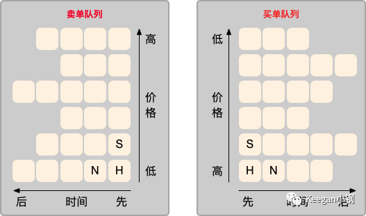 如上图,每个小方格表示一个委托单,标 H 的是排在头部的委托单,N 则是与 H 同价格但下单时间上排在 H 后面的委托单,S 则是下一档位价格的第一个委托单。可以从图中明显看出,水平方向,委托单是按时间排序的,垂直方向,又是按价格排序的。