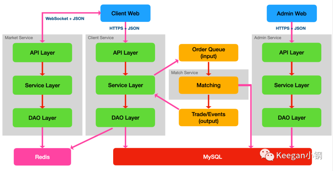 最后,使用内存撮合,严重依赖于服务器内存,不适合与其他服务共享内存,所以也应该将其抽离成单独的撮合引擎服务。这个抽离其实也简单,因为撮合引擎的输入是定序的订单队列,输出也是用队列。最终,我们的交易系统整体架构又变成了下图: